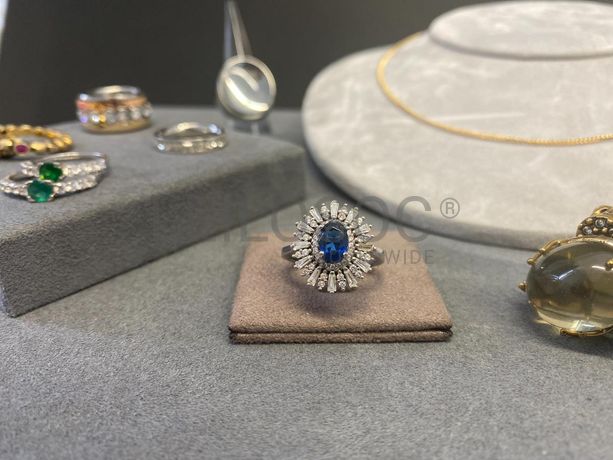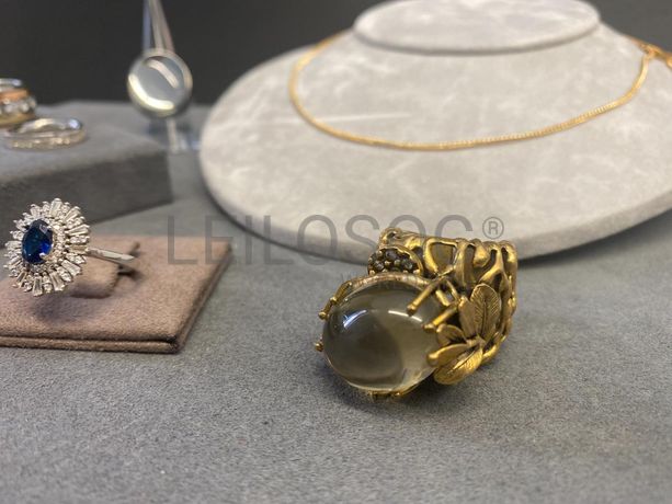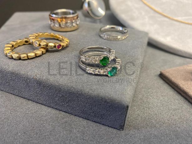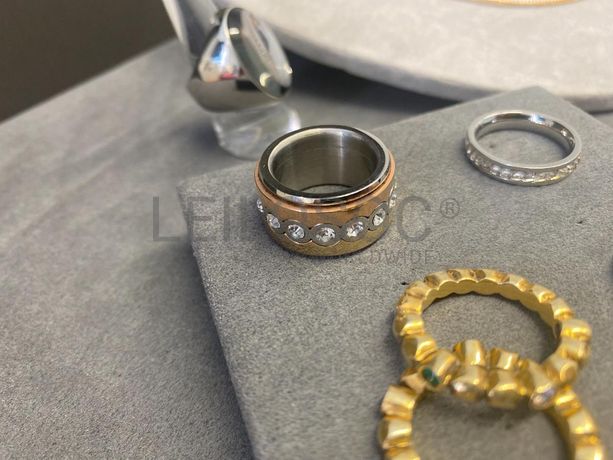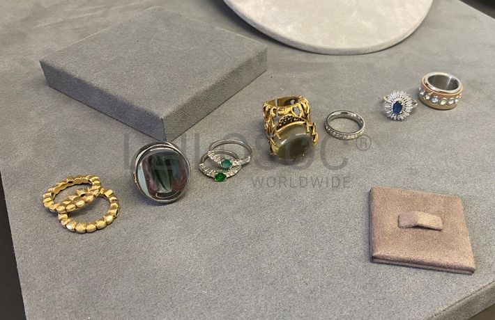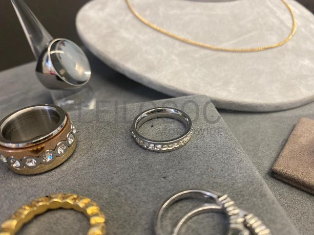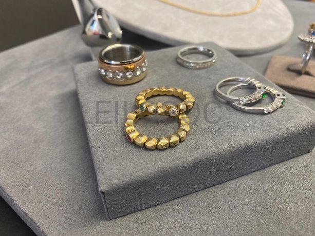 7 Anéis de vários formatos e pedras distintas e 1 fio dourado.