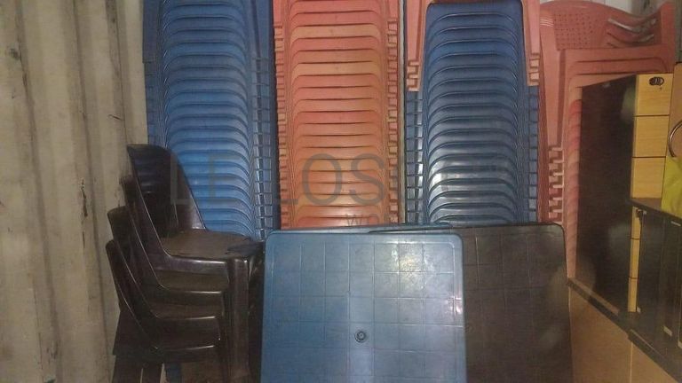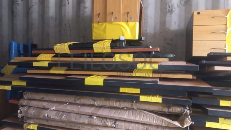 46 Pranchas para prateleiras metálicas + 15 Secretarias desmontadas, 4 blocos rodados + 125 cadeiras plásticas, 41 mesas plásticas + 20 secretarias desmontadas e 8 blocos rodado + 4 armários metálicos + 25 cadeiras giratorias pretas , 7 cadeiras fixas + 5 blocos rodado de madeira e 4 blocos rodado plasticos + 1 prateleira metalica desmontada + 26 porta papeis + 1 Ar condicionado de marca GREE 24000BT e 1 respirador do Ac de marca Alliance + 5 Armários de madeira + Cerca de 300 embalagens de separadores + 25 Fitas de insolamento e 500m + 36 caixas de pasta de arquivos 20 por caixa + Um contentor de 40P