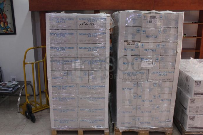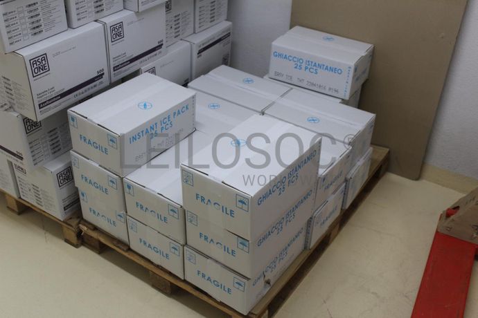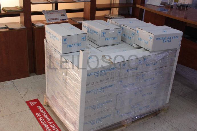 Stock de gelo instantâneo composto por cerca de 240 caixas de 25 unidades.