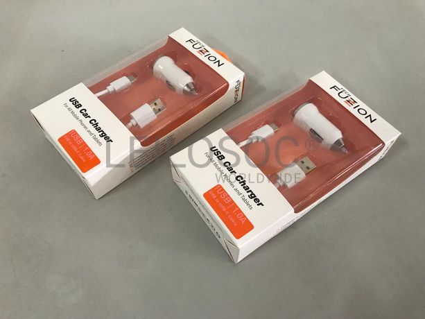Pack de duas unidades de carregador de isqueiro de 12V para o carro + cabo USB Tipo-C, da marca TECH FUZZION, para carregar telemóveis e tablets. Total 4 peças. Artigo Novo. Nota: não acresce IVA.