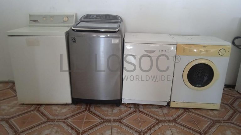 Duas máquinas de lavar roupa, uma marca speed Queen, uma marca Samsung, uma de secar roupa marca Defy e uma de lavar loiça marca general eletric