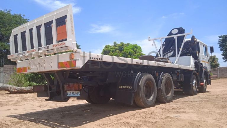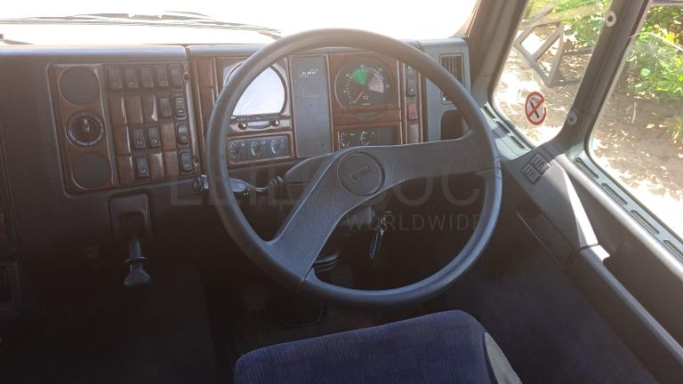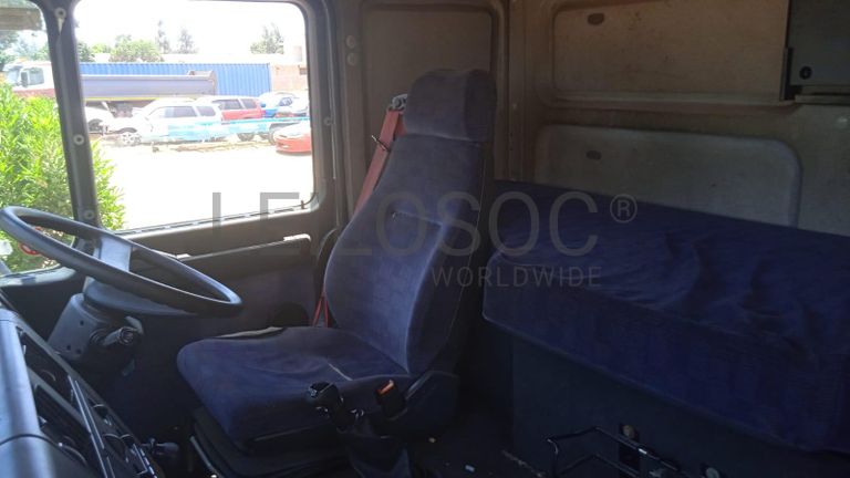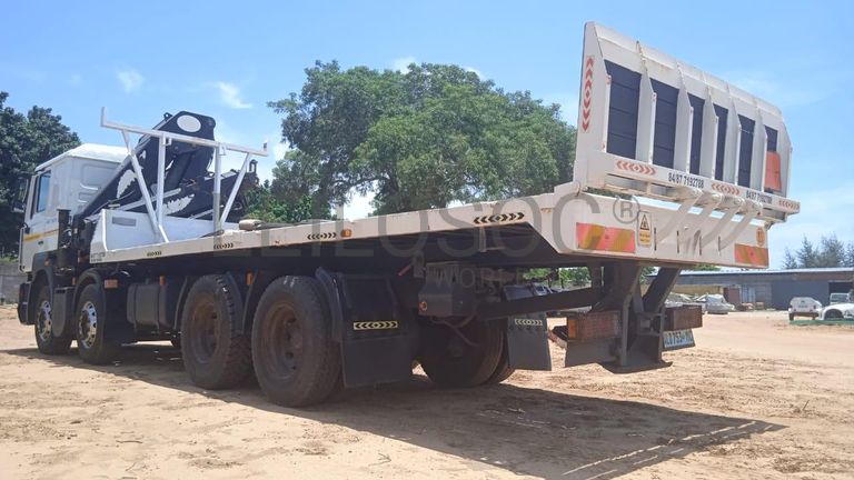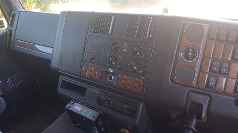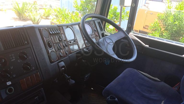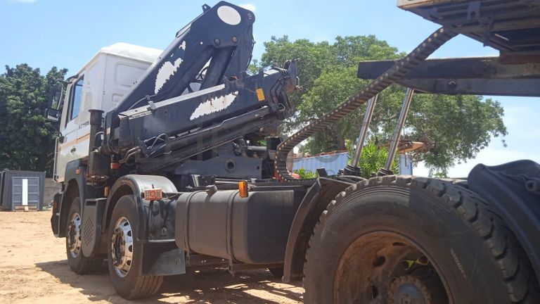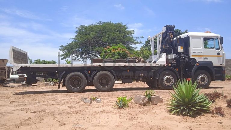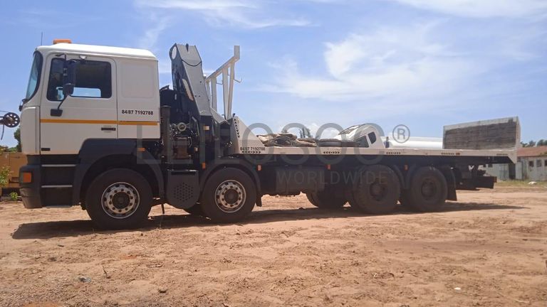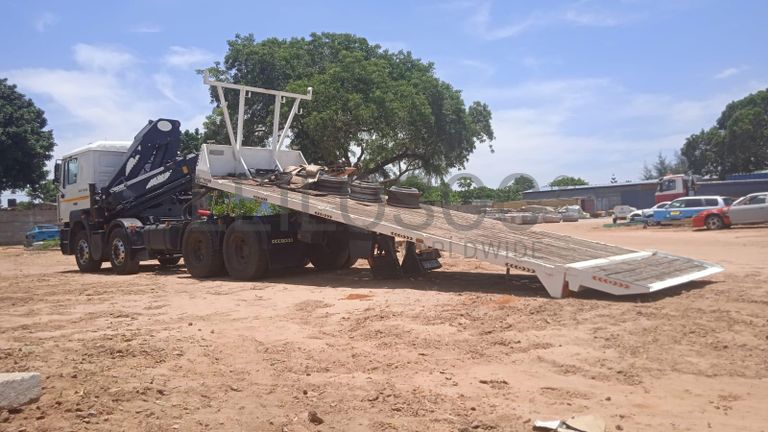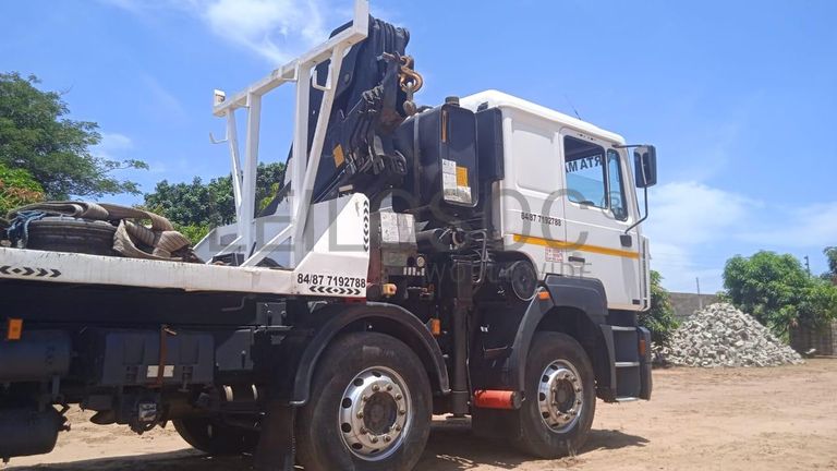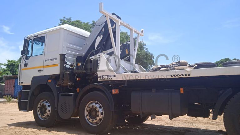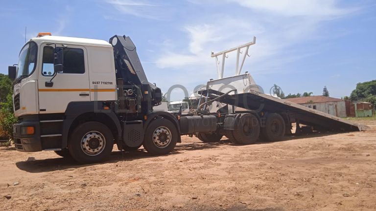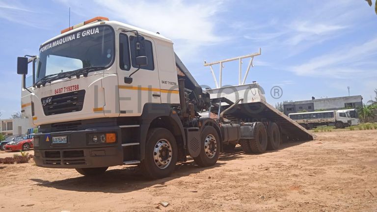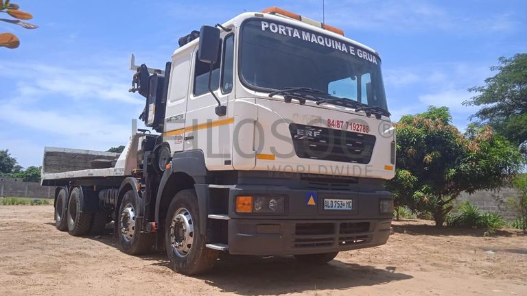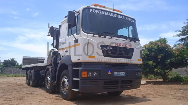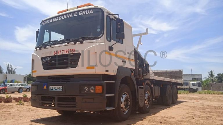 Camião porta máquinas com grua, marca ERF, modelo ECS, ano de fabrico 2002, matrícula ALD-753-MC, com cerca de 503480km, caixa manual, com doze rodas, capacidade 15 toneladas