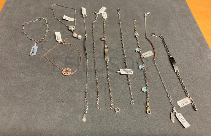 10 Pulseiras em prata e outros materiais, de diversos formatos e cores.