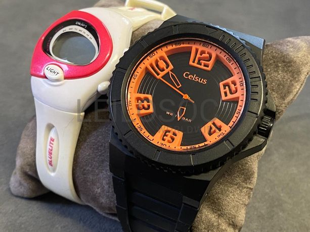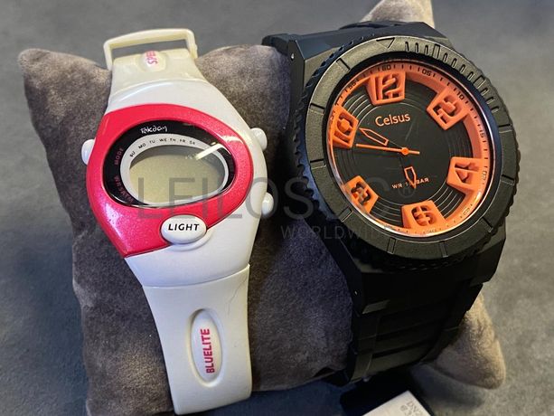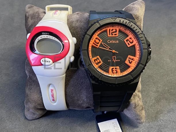 Relógio da marca CELSUS, preto e laranja e Relógio da marca TEKDAY branco e rosa.