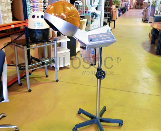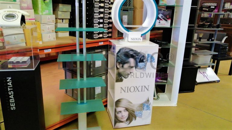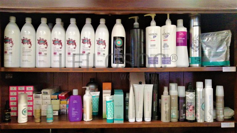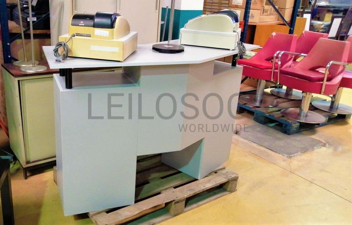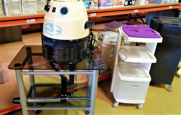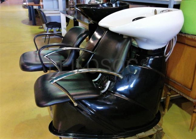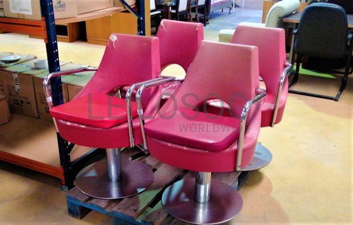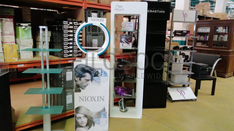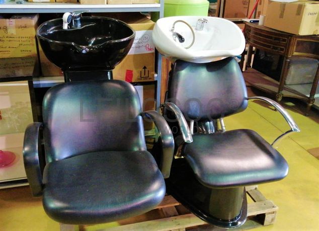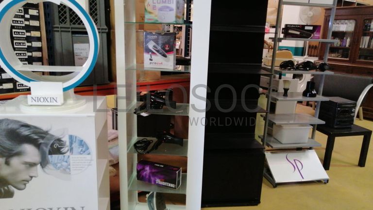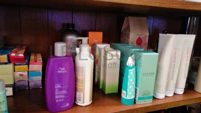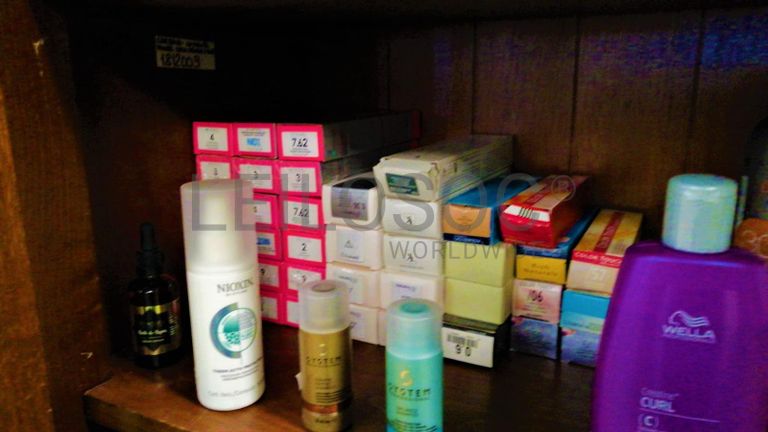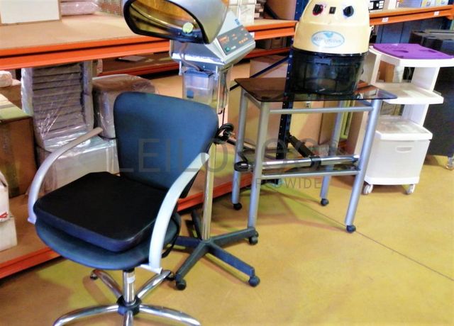 Acessórios para cabeleireiro, composto por 4 cadeiras com sistema de elevação de cor vermelho, cadeira com elevação de cor preto, mesa retangular com tampo em vidro, vaporizador Julle plus, expositor Wella, expositor SP, expositor Sebastian, expositor Sebastian com luz led, expositor Nioxin, expositor com 4 prateleiras em vidro, 2 calhas (rampa de lavagem de cabelos, 2 bancos de 2 lugares de cor preta, carrinho de apoio Sasson, carrinho de apoio com diversas gavetas, balcão de receção, secador de cabelo, 2 máquinas de cortar cabelo inoperacionais, ventoinha, máquina de cera, cabide, mesa de apoio de cor preta, 2 caixas registadoras Oliva, telefone, aparelhagem de som, banco, secador de cabelo de pé Rowenta, ferro de engomar, vaso, marquesa de cor preta, termoacumulador 150l, máquina de lavar roupa, cacifo de 6 portas, lote de produtos diversos usados, lote de produtos diversos em estado de novo.