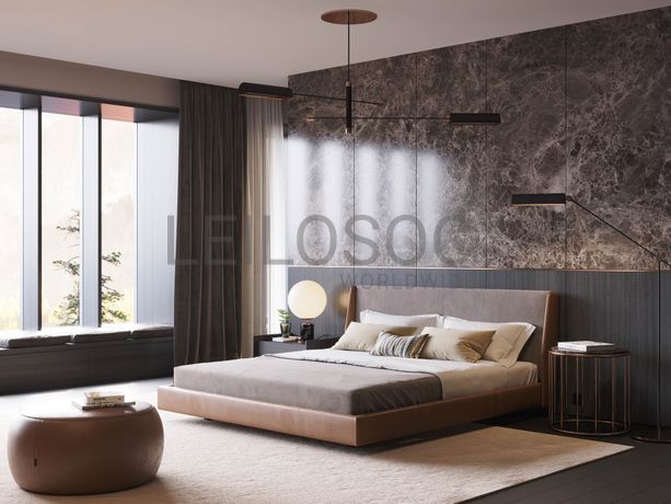 Cheselong tecido cinza, quarto de cor bege, sommier.