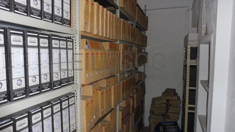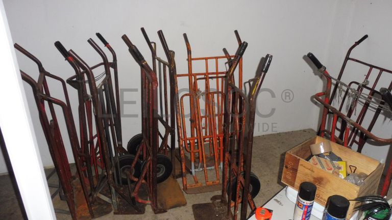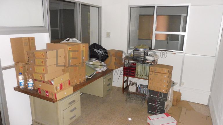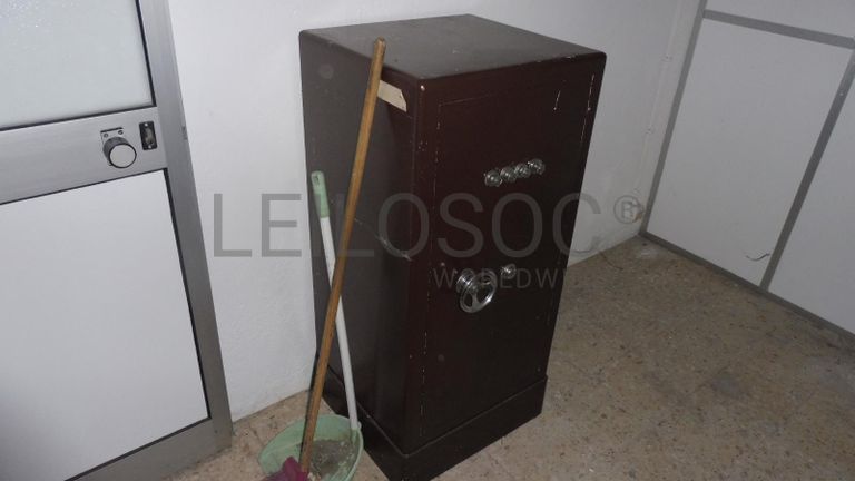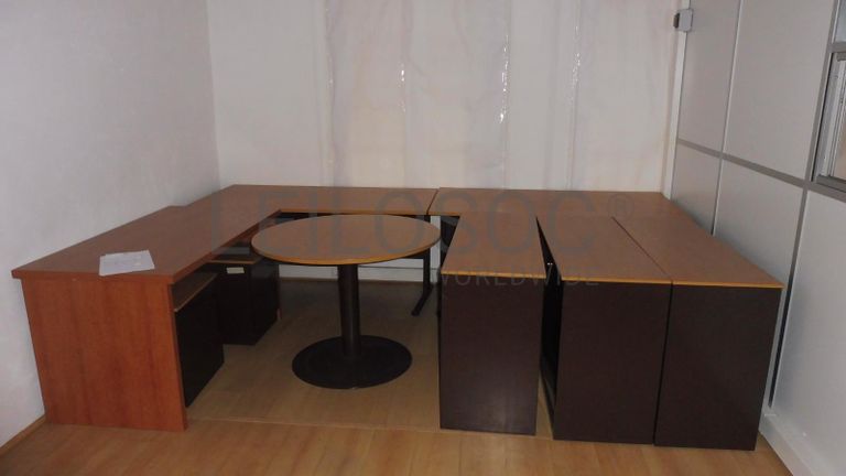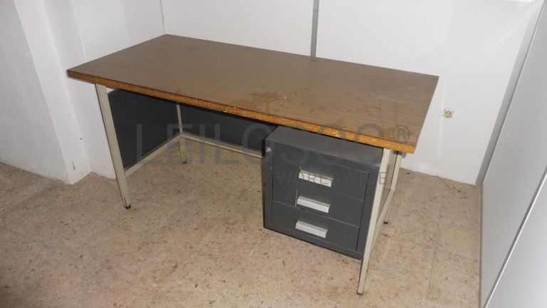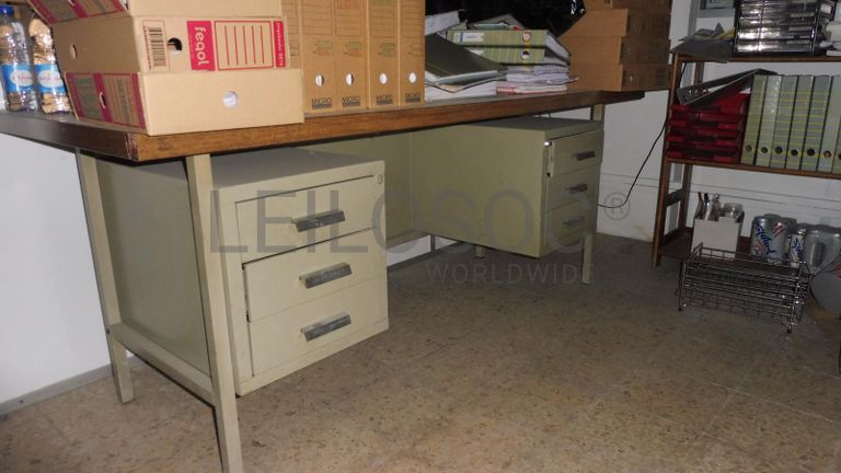 Lote composto por: Cofre, 2 blocos de gavetas com 3 gavetas, 3 secretárias, mesa redonda, 3 armários de arquivo baixos com portas de correr, secretária com 2 módulos de gavetas de 3 gavetas, secretária com módulo de gavetas de 3 gavetas, estantes de dexion, 10 carros de transporte de mercadorias.